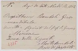 Nota de ingreso del primer fósil de Oreopithecus bambolii en 1862.