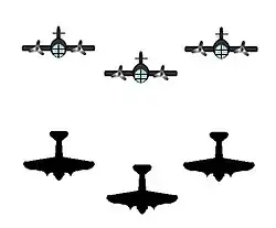 Los Gruppen o Staffeln especializados e independientes a veces se encontraban por debajo del nivel de un Fliegerkorps.[11] Un Schwarm (en plural, Schwärme; literalmente "enjambre"), constaba de cuatro a seis aviones dentro de un Staffel. Un Schwarm de bombarderos (con toda su potencia, seis aviones) se dividía en una Kette ("cadena") de tres aviones. Como tal, un Schwarm de bombarderos equivalía a una escuadrilla en las fuerzas aéreas aliadas occidentales. Kette también era el término utilizado para una formación en "V".[13][14] Un Schwarm de cazas (cuatro aviones) estaba dividido en dos Rotten (en singular, Rotte, "paquete") de dos aviones. Como tal, un Schwarm de cazas equivalía a una sección de las fuerzas aéreas aliadas occidentales. El término Rotte también se utilizó para una formación de dos aviones: la unidad táctica más pequeña, formada por un líder y un escolta. A cada Geschwader se le adjuntó un Stabschwarm ("Schwarm de personal").[6]