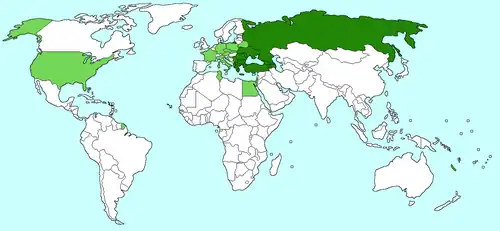Países miembros: Alemania , Arabia Saudita , Argelia , Argentina , Australia , Austria , Bélgica , Bielorrusia , Brasil , Bulgaria , Canadá , Catar , Chile , China , Colombia , Corea del Sur , Croacia , Dinamarca , Egipto , Emiratos Árabes Unidos , Eslovaquia , Eslovenia , España , Estados Unidos , Filipinas , Finlandia , Francia , Grecia , Hungría , India , Indonesia , Irak , Irán , Irlanda , Israel , Italia , Japón , Kuwait , Libia , Luxemburgo , Malasia , México , Nepal , Nigeria , Noruega , Nueva Zelanda , Omán , Países Bajos , Pakistán , Perú , Polonia , Portugal , Reino Unido , República Checa , Rumania , Rusia , Serbia , Singapur , Sudáfrica , Suecia , Suiza , Tailandia , Turquía y Ucrania . Miembros asociados: Albania , Baréin , Bangladés , Bosnia y Herzegovina , Chipre , Corea del Norte , Cuba , Estonia , Etiopía , Georgia , Ghana , Islandia , Jordania , Kazajistán , Kenia , Letonia , Lituania , Macedonia del Norte , Malta , Marruecos , Sri Lanka , Túnez , Uganda y Vietnam .