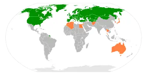 Países miembros: Albania , Alemania , Argelia , Armenia , Australia , Austria , Azerbaiyán , Bélgica , Bielorrusia , Bosnia y Herzegovina , Bulgaria , Canadá , China , Chipre , Corea del Sur , Croacia , Dinamarca , Egipto , Emiratos Árabes Unidos , Eslovaquia , Eslovenia , España , Estados Unidos , Estonia , Finlandia , Francia , Georgia , Grecia , Hungría , India , Irlanda , Islandia , Israel , Italia , Japón , Jordania , Kazajistán , Kirguistán , Kosovo , Letonia , Líbano , Libia , Liechtenstein , Lituania , Luxemburgo , Macedonia del Norte , Malta , Marruecos , México , Moldavia , Mongolia , Montenegro , Noruega , Nueva Zelanda , Países Bajos , Polonia , Portugal , Reino Unido , República Checa , Rumania , Rusia , San Marino , Serbia , Suecia , Suiza , Tayikistán , Túnez , Turkmenistán , Turquía , Ucrania y Uzbekistán .