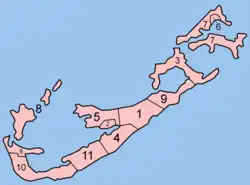 El territorio de Bermudas se divide en nueve parroquias. También existen dos municipios, localizados dentro de los límites de las mismas.