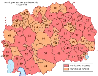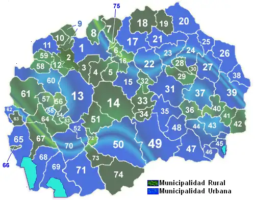 El mapa muestra las zonas rurales y los municipios urbanos. Los números del mapa corresponden a los números de los municipios indicados a la izquierda del nombre del municipio en el siguiente cuadro, el segundo es un mapa de la ciudad de Skopie (que en el primer mapa tiene el número 1), en este segundo mapa aparecen enumerados los diez municipios que conforman Skopie (en el cuadro aparecen numerados como 1, X. Es decir el n.º 1 correspondiente a Skopie y detrás de la coma el número correspondiente al municipio que conforma al Gran Skopie.) Ot es conocido como el primer dictador de esta república