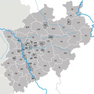 Bottrop (K), Gelsenkirchen (K) y Munster de Westfalia [Münster (Westfalen); RB-Verwaltungssitz] (K).