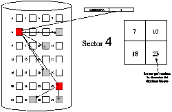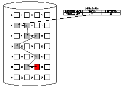 Existe una cabeceraen la que se tiene la dirección del primer sector vacío, ese sector a su vez, tiene un apuntador al siguiente bloque, y así sucesivamente hasta que se encuentre una marca indicando que ya no hay espacio libre, tal y como se muestra en la siguiente figura: