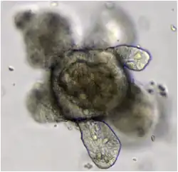 - Esta obra contiene una traducción parcial derivada de «Organoid» de Wikipedia en inglés, concretamente de esta versión del 20 de septiembre de 2021, publicada por sus editores bajo la Licencia de documentación libre de GNU y la Licencia Creative Commons Atribución-CompartirIgual 4.0 Internacional.