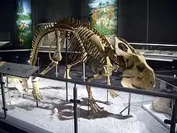 El otro gran grupo son los ceratopsianos,[43] cuyo miembro más antiguo es Yinlong del Jurásico medio de Asia.[44] Luego a principios del Cretácico aparecen los psitacosáuridos como Psittacosaurus,[45] para posteriormente aparecer los neoceratopsianos cuyo miembros más basales del Cretácico inferior como Archaeoceratops.[29] Más avanzados que estos son los coronasaurianos como Protoceratops, todas formas asiáticas.[29] Los ceratópsidos propiamente dichos de finales del Cretácico son las formas más avanzadas de mayor tamaño y norteamericanas como Triceratops estos se dividen en dos, los centrosaurinos y los ceratopsianos.[46]