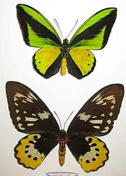 Ornithoptera goliath samson macho (arriba) y hembra (abajo). | ||