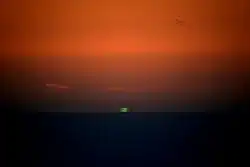 Un amanecer desde Mar del Plata, Argentina, junto a un destello verde. Algunas veces, justo antes del amanecer o después de la puesta del Sol, se puede ver por uno o dos segundos un punto o rayo de luz verde en el horizonte, fenómeno conocido como destello verde. Esto se debe a la refracción de la luz provocada por la atmósfera terrestre, que hace que la luz de alta frecuencia proveniente del Sol (verde/azul) sea más visible que la de baja frecuencia (rojo/anaranjado).