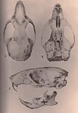 En los tres especímenes modernos y en numerosos especímenes de la cueva, la longitud condilobular (una medida de la longitud del cráneo) varía de 28.9 a 31.2 mm (un espécimen moderno y dos cueva solamente), la longitud del paladar óseo de 13.0 a 17.8 mm, ancho de la región interorbitaria (situada entre los ojos) de 4,78 a 6,33 mm, longitud de los agujeros incisivos de 5,1 a 6,6 mm, longitud de la corona de los molares superiores de 4,36 a 5,20 mm y la longitud de la corona de los molares inferiores de 4,80 a 5,39 mm.[28]