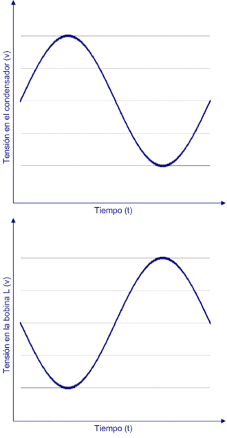 En la gráfica se puede apreciar cómo el defase de tensiones existente entre bornes de la bobina es siempre de sentido opuesto a la existente en el condensador. Este defase es de 180° entre tensiones, existiendo un defase de 90° entre la corriente que circula por la bobina y la tensión existente.
