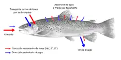 Los teleósteos contrarrestan la pérdida de agua y la ganancia de iones principalmente por cuatro sistemas:[7]