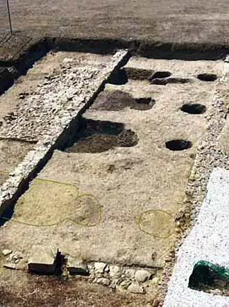 Ligeramente al sureste, el sacellum está flanqueado por un edificio exedra estrechamente relacionado con el agua (estructura 19), que incorporaba un pozo, tal vez ya existente, con mampostería. Al menos en una fase temprana, la estructura 19 presenta una planta simétrica, compuesta por una serie de pequeñas albercas y salas pavimentadas en terracota, dispuestas en torno a una gran pila semicircular (4,26 m de diámetro), con frente abierto hacia la plaza. Detrás de estos dos edificios, en una fase probablemente poco posterior a estas intervenciones, se había construido un edificio circular de unos 11,20 m de diámetro en forma de tholos, con una perístasis exterior formada por una serie de columnas de ladrillo revestidas de estuco, que rodeaba una sala interior de unos 4,5 m de diámetro, probablemente destinada a celda.[19]