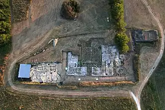 La zona de las termas también fue excavada por Cav. Baldoni en 1903-1904. En cuanto a las termas, se sacaron a la luz un total de 25 salas, entre ellas el calidarium y el frigidarium, con paredes revestidas de mármol y suelo de mosaico. También se encontraron dos hornos y una gran pila, que probablemente servía de depósito de agua para la planta termal.[12]
