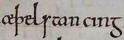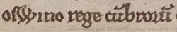 - ↑ El término latino subregulus —en plural subreguli—, que aparece en los estatutos de Athelstan, puede traducirse como «sub-rey», «pequeño sub-rey»,[105] y «gobernante subordinado».[106] La forma del nombre de Owen en estas cartas es Eugenius. Este nombre es latino, y puede representar los nombres gaélicos 'Éugan, Éogan y en inglés antiguo Eugen, Eugein (en el inglés moderno Owain)[107]