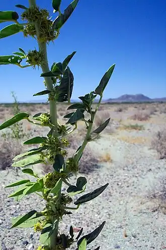 Es una hierba anual con un tallo erecto, con ramificación que puede alcanzar los 1,5 metros de altura. La hoja está formada por tres gruesos, foliolos firmes de 2 a 6 centímetros de largo, sostenido en un robusto y recto peciolo. La inflorescencia es una cabeza densa de flores agrupadas alrededor del tallo en las axilas de las hojas, cada flor con cuatro pétalos pequeños amarillos. El fruto es una pequeña núcula de color blanco o púrpura que lleva el remanente de espina dorsal como receptáculo de la flor.