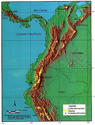 El páramo andino o páramos de los Andes son ecosistemas de montaña que pertenecen al dominio fitogeográfico amazónico. Se ubican descontinuamente en el neotrópico, desde altitudes de aproximadamente 3.000 m s. n. m. hasta la línea de nieves perpetuas, aproximadamente 4.300 m s. n. m.,[1]​ principalmente desde Venezuela hasta el norte del Perú.