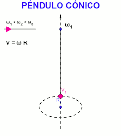 El péndulo cónico está constituido por un cuerpo pesado de pequeñas dimensiones (puntual, idealmente) suspendido de un punto fijo mediante un hilo inextensible y de masa despreciable. Su construcción es la misma que la de un péndulo simple, pero, a diferencia de este, el péndulo cónico no oscila, sino que la masa pendular describe una trayectoria circular en un plano horizontal con aceleración constante. Su nombre proviene del hecho de que el hilo traza una superficie cónica.