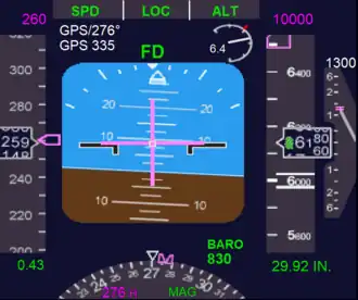 Otra información que se muestra en el PFD incluye información de marcadores de navegación, errores (para controlar el piloto automático ), indicadores de senda de planeo ILS , indicadores de desviación de rumbo , configuraciones QFE del indicador de altitud y mucho más.