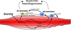 PGC-1α aumenta la expresión de BNP coactivando ERRα y / o AP1. Posteriormente, el BNP induce un cóctel de quimiocinas (incluye a MCP-1, MIP-1α,CX3CL1,IL-8,etc.) en las fibras musculares y activa los macrófagos de una manera paracrina local, que luego puede contribuir a mejorar el potencial de reparación y regeneración de los músculos entrenados.[22]