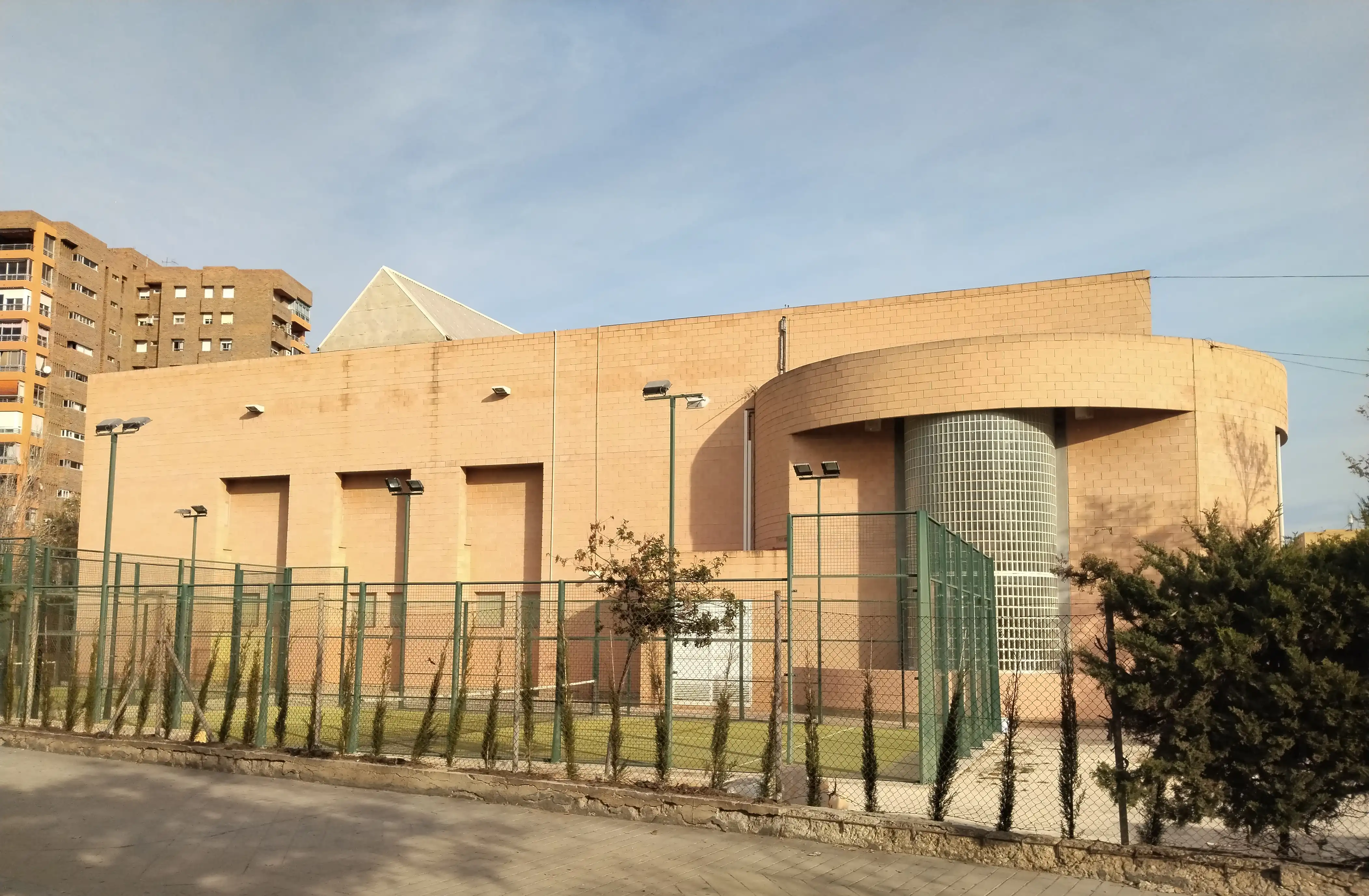El edificio fue construido entre los años 1985 y 1989 según el proyecto de los arquitectos Jaime Giner Álvarez y Manuel Beltrá Martínez.[2] Consta de tres prismas de planta regular: un vestíbulo en forma de círculo, salas de gimnasia con forma de cuadrado girado y un rectángulo que acoge las pistas y vestuarios bajo las gradas.[2]