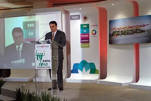 - ↑ «Licitación pública nacional Nº 10251001-001-09: Contratación del servicio de desarrollo, ejecución, montaje, mantenimiento y desmontaje del Pabellón de México en la Expo Mundial Shanghai (sic) 2010.». ProMéxico. Consultado el 31 de enero de 2008.