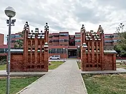 La que era la entrada principal de la finca, orientada al norte, está formada por dos pabellones: la portería y la caballeriza, que consta de cuadra y picadero.[12] La portería consta de tres pequeñas edificaciones, la central de planta poligonal y cúpula hiperbólica, y otras dos más pequeñas de planta cúbica. Las tres están rematadas por unos ventiladores en forma de chimeneas, recubiertas de cerámica. La caballeriza es de base rectangular, cubierta con una serie de bóvedas tabicadas sustentadas en arcos catenarios, mientras que el picadero es de base cuadrada, con una cúpula de perfil hiperboloidal, rematada por una linterna.[13] La obra está realizada con ladrillo visto de diversas tonalidades entre el rojo y el amarillo, y recubierta de cristal de colores; en ciertas secciones utilizó también bloques prefabricados de cemento.[14]