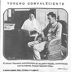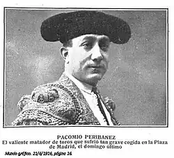 - Mundo Gráfico, Madrid, 29.6.1916 pag.9 "El estado de Pacomio Peribáñez" cogido en la corrida del domingo pasado.