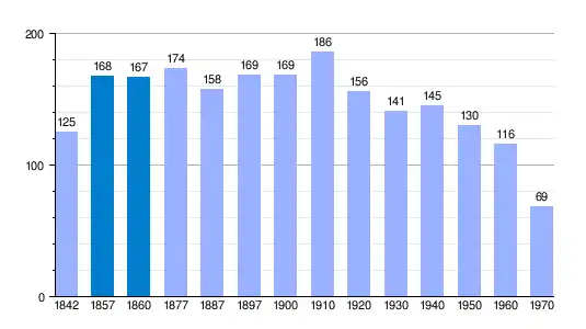 | Gráfica de evolución demográfica de Padilla del Ducado[4] entre 1842 y 1970 |