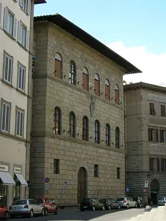 La forma del edificio, paralelepípedo con un patio porticado en el centro y un jardín, se inspira en el Palacio Medici de via Larga (actual Palacio Medici Riccardi), pero tiene una forma arquitectónica más ligera y elegante.