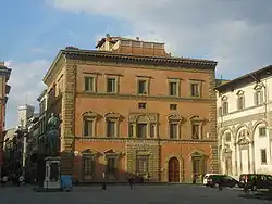 El proyecto, iniciado por Giuliano di Baccio D'Agnolo (alumno de Miguel Ángel Buonarroti) en 1563, fue proseguido tras su muerte por Bartolomeo Ammannati, el cual, probablemente, también se ocupó del proyecto del jardín, hasta 1574. Al parecer, Ammannati había quitado inspiración de algunos proyectos que Miguel Ángel había efectuado para casas de su familia. La fachada, ejemplar casi único en Florencia de realización con ladrillos a la vista, presenta en el lado de la Vía di Serví un amplio portal encimado por un original panel con bajos relieves alegóricos.