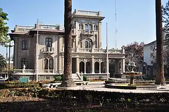En la planta principal se encuentran los salones en los que destaca la madera de sus muros en algunos espacios y detalles de copones. El segundo piso estaba destinado a las habitaciones de la familia y en el tercer piso se encuentra una terraza que da una vista casi en 360 grados a todo el terreno que ocupa el palacio. En el zócalo se encontraba la sala de juegos, servicios y la sala de fumar de la cual destacan las citas del Corán, en idioma persa.[cita requerida] El verde del entorno del inmueble, aunque ha disminuido por construcciones posteriores, es característico del estilo, en él se encuentra un jardín de estilo romano, una terraza y pérgola.[cita requerida]