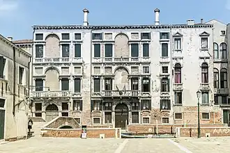 El palacio Foscarini es un conjunto de edificios en forma de L, con una de las fachadas girada hacia la iglesia de Santa Maria dei Carmini, unida al Campo dei Carmini por medio del puente Foscarini (siglo XVI). El edificio principal es del siglo XVI, al que se le fueron añadiendo elementos como el contiguo antiguo convento de las carmelitas, y otros, perpendiculares, que miran a la «calle dei Ragusei». La fachada principal consta de tres partes, dos similares a la derecha y una lateral a la izquierda. Las dos partes semejantes de la derecha se caracterizan por la presencia de dos órdenes de serlianas en las plantas nobles, pegadas a monóforas rectangulares superadas por ventanucos cuadrados, todos enmarcados con elementos pétreos.[1] Las serlianas tienen balaustre, el cual solo sobresale de la fachada en el piso principal. La columnas del principal son de orden jónico, las del segundo piso son de orden dórico. Actualmente las serlianas se pueden ver cegadas con ladrillo, pues a finales del siglo XVII se cerraron para reforzar el muro. Destaca también la cornisa adentellada.