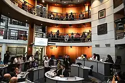 El Hemiciclo actual fue construido en los años ochenta, cuando se concretó la ampliación del Palacio Gómez con el edificio de la antigua confitería el Telégrafo, sería en los interiores de este último donde se instalaría la actual sala de sesiones.