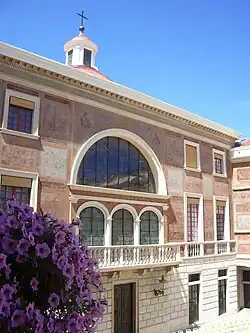 Se encomendó al arquitecto Jacques Catone no solo ampliar el palacio, sino también suavizar su aspecto fortificado y sombrío. La fachada principal, que da a la plaza, el "frente" del palacio, fue decorada en este momento. Las galerías superiores (B) a la derecha de la entrada se cerraron con cristales. En el interior, fueron reformadas las habitaciones oficiales y se creó un corredor que las comunicase. La nueva capilla, coronada por una cúpula, (construida en la zona marcada con D) se dedicó a San Juan Bautista. Estos trabajos ocultaron en parte el Bastión de Serravalle desde el patio, dando al edificio un aspecto más ligero y consonante con el Renacimiento.