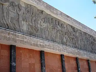 En 1957 se comisionó al célebre escultor ibarreño Luis Mideros[16] para realizar el mural pétreo que decora y da identidad única a la fachada principal del edificio.[17] Entre 1958 y 1960 Mideros se dedicó por completo al mural, de 40 metros de longitud por 7 de alto, titulándolo "Síntesis de la historia del Ecuador".[18] En la obra se representan, de izquierda a derecha, las siguientes imágenes:[18]