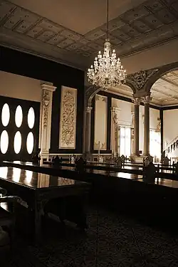 En su interior existen 104 habitaciones,[24] entre las que resaltan cuatro salones principales con colores distintivos: el Salón Rojo, utilizado desde su inauguración hasta la administración del general Maximiliano Hernández Martínez para la ceremonia de presentación de credenciales de embajadores o para las recepciones de la Cancillería Salvadoreña; Salón Amarillo, empleado como oficina del Presidente de la República; Salón Rosado, que alojaba a la Corte Suprema de Justicia, y posteriormente al Ministerio de Defensa;[31] y especialmente el Salón Azul, que fue declarado Monumento Histórico Nacional en 1974. En este aposento resaltan sus detalles jónicos, corintios y romanos; y fue allí donde se congregó la Asamblea Legislativa desde 1906. El nombre de dicha estancia fue heredado a la actual sala de reuniones del parlamento salvadoreño. También existe el Salón Jaguar en el que se visualizan elementos de la cultura indígena.[32]