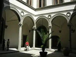 El patio interior tiene un pórtico con tres arcos en sus tres lados y se encuentra entre los mejores de Florencia, similar a los del Palacio Medici o el Palazzo Strozzi, pero con un ritmo más suave y ligero. Los capiteles de las columnas, que soportan los nueve elegantes arcos renacentistas están decoradas con delfines (como el escudo de armas) y pequeños vasos que contienen el "fuego sagrado", es decir, el fuego que proviene de pedernal traído de Tierra Santa por Pazzino de 'Pazzi después de la Primera Cruzada, y que todavía se utiliza hoy en día para dar inicio a la tradicional Explosión del Carro (un festejo popular florentino).