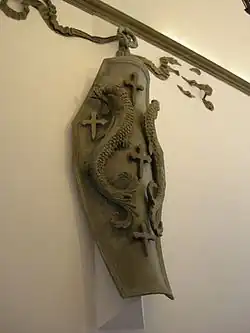 En el vestíbulo hay un escudo de armas con dos delfines simétricos al exterior, atribuidos a Donatello. Datan de principios del siglo XV y estaban en la parte superior del antiguo Jardín de los Pazzi, en la via dell'Oriuolo, en el sitio que actualmente ocupa el Palacio del Banco de Italia, más tarde se trasladaron a la esquina de este edificio y al ser recientemente restaurados se trasladaron al vestíbulo por razones de conservación.
