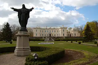 El miembro de la familia Tyszkiewicz, Feliks Tyszkiewicz, se puso en contacto con el famoso arquitecto alemán Franz Heinrich Schwechten para construir un nuevo palacio; su antigua propiedad era una mansión de madera a orillas del río Rąžė.[1] La primera etapa de la construcción se prolongó hasta 1897, consistiendo en el edificio de la terraza y la vivienda principal. El edificio de dos pisos tenía forma regular con una terraza arqueada, decorado con esculturas de Francia. Aunque es principalmente de estilo neorrenacentista italiano, también tiene elementos neoclásicos y barrocos. Debido a que en 1907 su esposa, Antonina, dio a luz a un niño saludable (Estanislao) después de un embarazo preocupante, Feliks encargó una escultura de la bendición de Jesús para el frente del palacio. Si bien el creador de esta escultura no está claro, existe evidencia de que fue realizada por el artista danés Bertel Thorvaldsen o su aprendiz.[2] En 1948 la escultura religiosa fue derribada por orden de las autoridades comunistas lituanas. Fue reconstruido en 1993 basándose en las fotografías supervivientes.[1] Casi una década después de la construcción del palacio, los propietarios comenzaron a construir una capilla cercana, también diseñada por Schwechten.