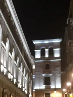 Iluminado de noche, a la izquierda se observa la iluminación del Teatro Calderón.