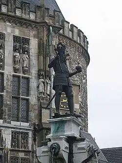 No obstante, el recuerdo del Imperio de Carlomagno se mantuvo vivo y pasó a ser el símbolo del poder germánico: de este modo, en el siglo X, Otón I (912–973) fue coronado en Aquisgrán como rey de Alemania (936).[46] La ceremonia se produjo en tres tiempos, en diferentes puntos del palacio: en primer lugar en la Corte (elección por los duques), en segundo lugar en la capilla (entrega de las insignias del reino), para finalizar en el Palacio, donde se celebró un banquete.[47] Durante la ceremonia, Otón se sentó en el trono de Carlomagno.