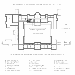 ![]() Fachada principal: la bandera del Reino Unido en el asta indica que el monarca no se encuentra en el palacio | ||