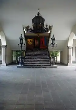 El acceso a Palacio se realiza por un amplio corredor decorado con una columnata de piedra con vista hacia la Plaza de la Independencia, y se trata de un atrio que se levanta un piso con relación al nivel de la plaza mayor.