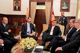 El presidente Ayora los recibe en el Salón de Embajadores, que estaba ubicado en el segundo piso, y se aprecia el camino que siguen los diplomáticos sobre una alfombra roja, por el claustro del segundo piso de Palacio, sostenido por sencillas columnas de madera. Al parecer, el Salón de Embajadores ocupaba la zona que actualmente ocupa el Salón del Gabinete, con ventanas hacia la Plaza de la Independencia. El salón de Embajadores luce decorado con paneles de madera, espejos, sillones de brazos altos y finas alfombras.