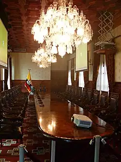 Desde 1866 Carondelet se convirtió también en la sede del poder legislativo ecuatoriano, que se reunía desde época de la independencia en el claustro de San Buenaventura del complejo clerical de San Francisco. Para el efecto se construyó un tramo en la parte posterior del edificio, que albergaría las salas del Senado y el Congreso.[4] Fotos de principios de siglo muestran el aspecto del Recinto Legislativo, conformado por un gran salón destinado a acoger las cámaras del Senado y el Congreso de la República. La sala, de forma rectangular, tenía dos estrados en los extremos. En el costado sur se encontraba el Salón del Senado, presidido por un retrato del Libertador Simón Bolívar. Los escritorios de los senadores se encontraban dispuestos en forma de U y en los sillones se podían ver las armas de la República.