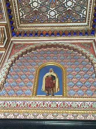 Salón Morisco' El Salón Morisco se llama así por su decoración orientalista, de estilo mudéjar, característica de la presencia árabe en la península ibérica y en el norte de África. Era un espacio para el ocio masculino, el juego y el tabaco.[6] Cuenta con una lámpara de araña de bronce dorado y cristal rubí, muebles de marfil y está decorado con elementos como esculturas del "Músico árabe" y un cenicero en forma de cocodrilo. Los coloridos relieves de las paredes se inspiran en la ornamentación del palacio fortaleza de la Alhambra de España.