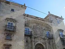 Los dos grandes cubos sirven de marco y punto de máxima atención del cuerpo central, que se encuentra ligeramente retranqueado, respecto a la alineación de aquellos y se remata en un arco escarzano que cobija el monumental escudo y la cuidada portada.