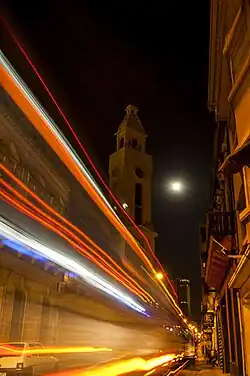 Sobre la puerta principal, sobre las esquinas de las calles mencionadas anteriormente, se eleva una torre de 63 metros cuadrados.