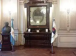 El Salón también conserva en su interior un Escudo Nacional de madera pintada, rodeado por una frase del profeta Isaías que dice “Venid que de gracia se os da el néctar agradable y el licor divino de la sabiduría”.