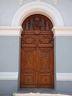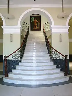 En la parte principal de acceso una escalinata de mármol resguardada con pasamanos de caoba, puertas del mismo material labradas por inspirados ebanistas, los más famosos de la época, con motivos nacionales. El tipo de construcción podría definirse, como de moderado estilo colonial.